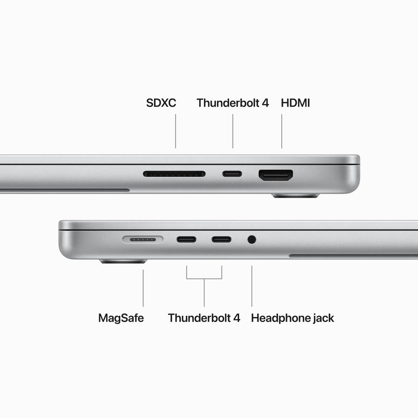 CONNECT IT ALL — This MacBook Pro features a MagSafe charging port, three Thunderbolt 4 ports, an SDXC card slot, an HDMI port and a headphone jack. Enjoy fast wireless connectivity with Wi-Fi 6E and Bluetooth 5.3. And you can connect up to two external displays with M3 Pro, or up to four with M3 Max.
