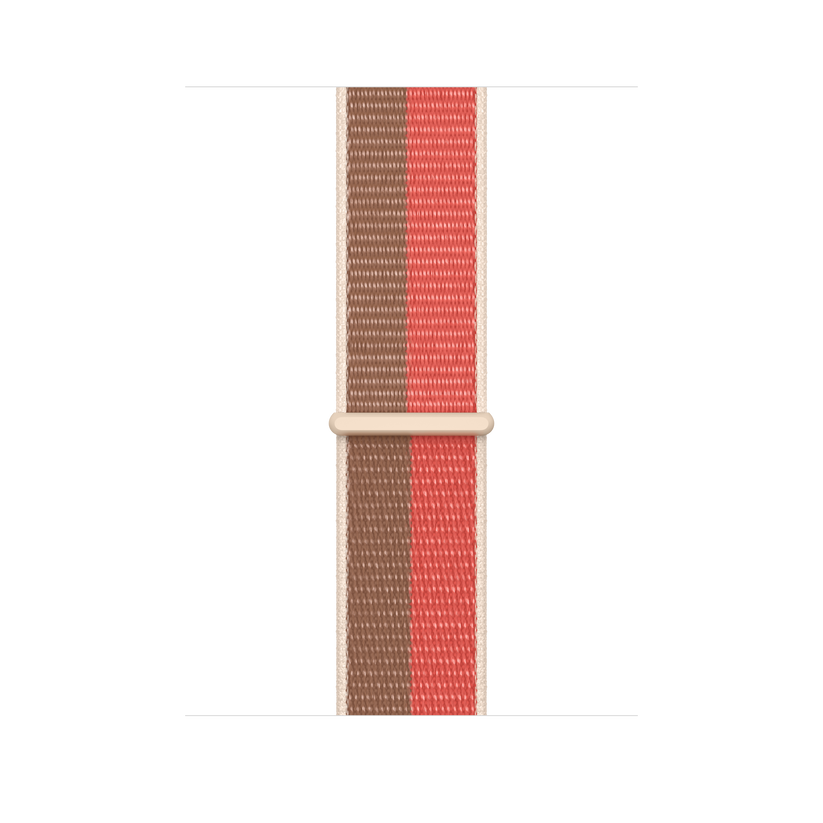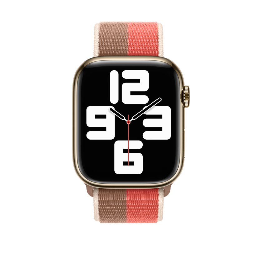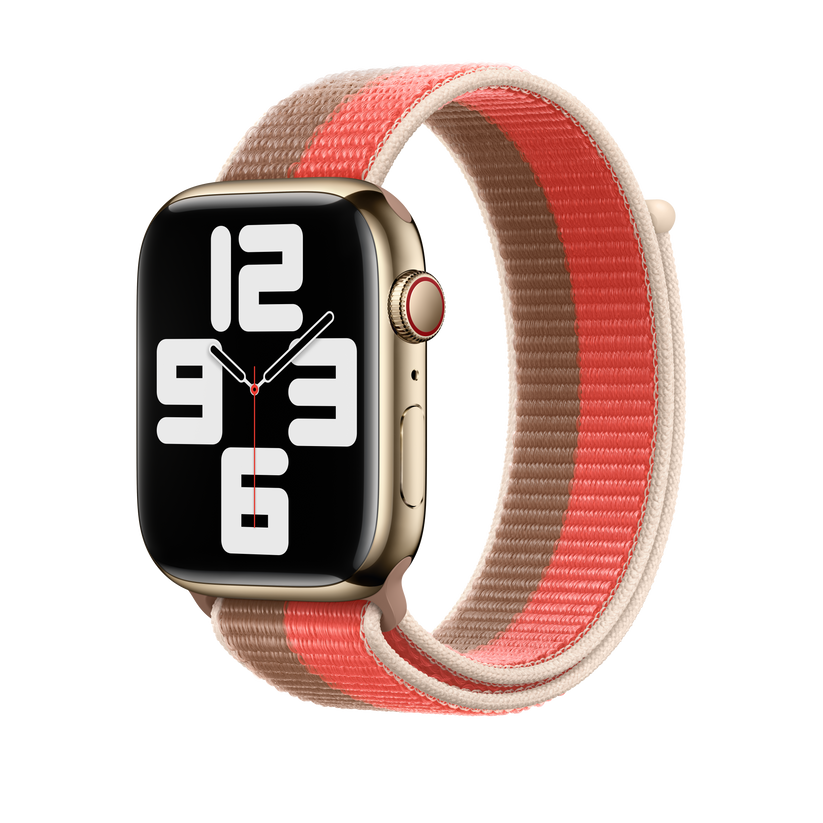 Soft, breathable and lightweight, the Sport Loop features a hook-and-loop fastener for quick and easy adjustment. The double-layer nylon weave has dense loops on the skin side that provide soft cushioning while allowing moisture to escape. This weave is made with 82% recycled yarn, some of which contains material from discarded fishing nets. This strap is carbon neutral. The Sport Loop contains 45% recycled content by weight, 100% of manufacturing electricity is covered by clean energy, and 50% or more of all carbon-neutral Apple Watch products are shipped without aeroplanes.