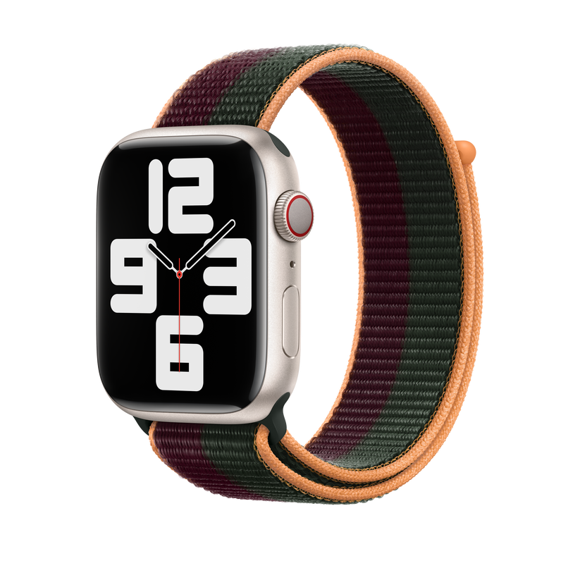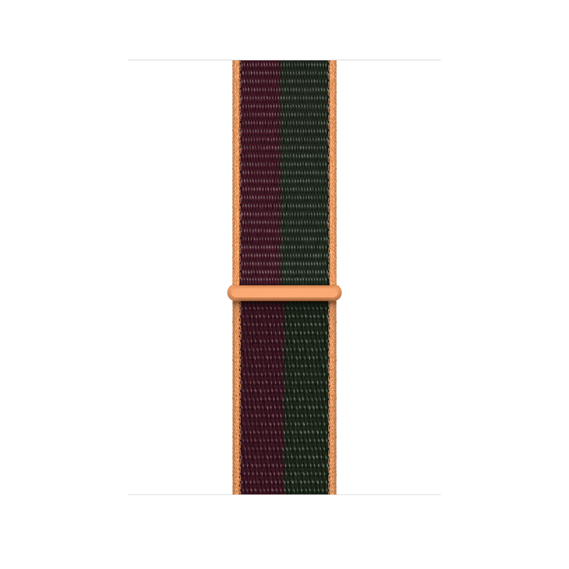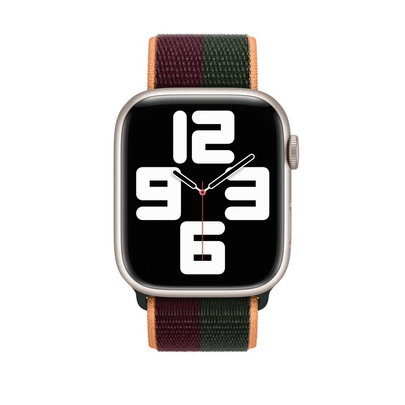 Soft, breathable and lightweight, the Sport Loop features a hook-and-loop fastener for quick and easy adjustment. The double-layer nylon weave has dense loops on the skin side that provide soft cushioning while allowing moisture to escape. This weave is made with 82% recycled yarn, some of which contains material from discarded fishing nets. This strap is carbon neutral. The Sport Loop contains 45% recycled content by weight, 100% of manufacturing electricity is covered by clean energy, and 50% or more of all carbon-neutral Apple Watch products are shipped without aeroplanes.