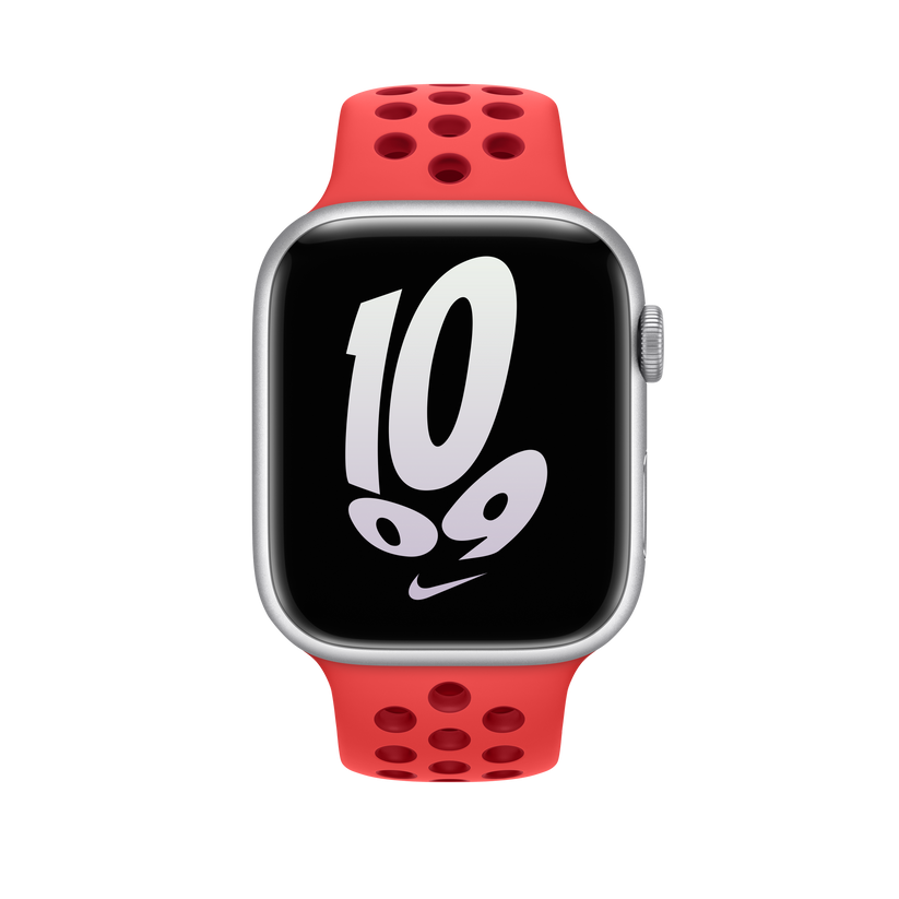 Made with compression-moulded perforations for breathability, the Nike Sport Band is durable and strong, yet surprisingly soft. It features colourful flakes that create a randomised pattern, making each strap completely unique. The smooth, dense material drapes elegantly across your wrist and feels comfortable next to your skin. A new aluminium pin-and-tuck closure gives the pin a fresh matt finish. This strap contains at least 32% recycled fluoroelastomer, with each flake containing at least 66% recycled fluoroelastomer.