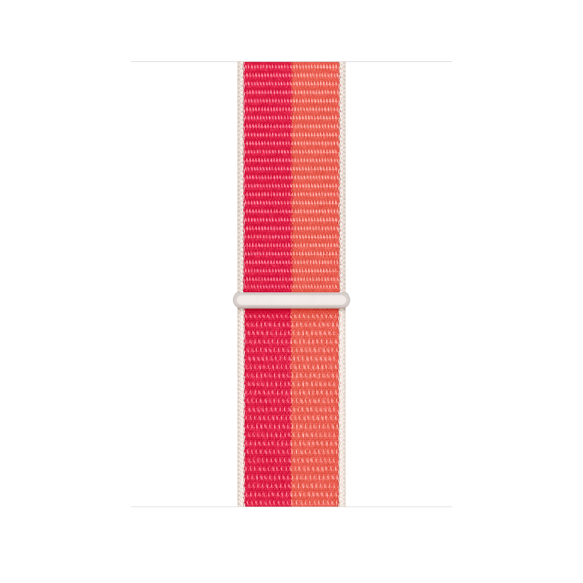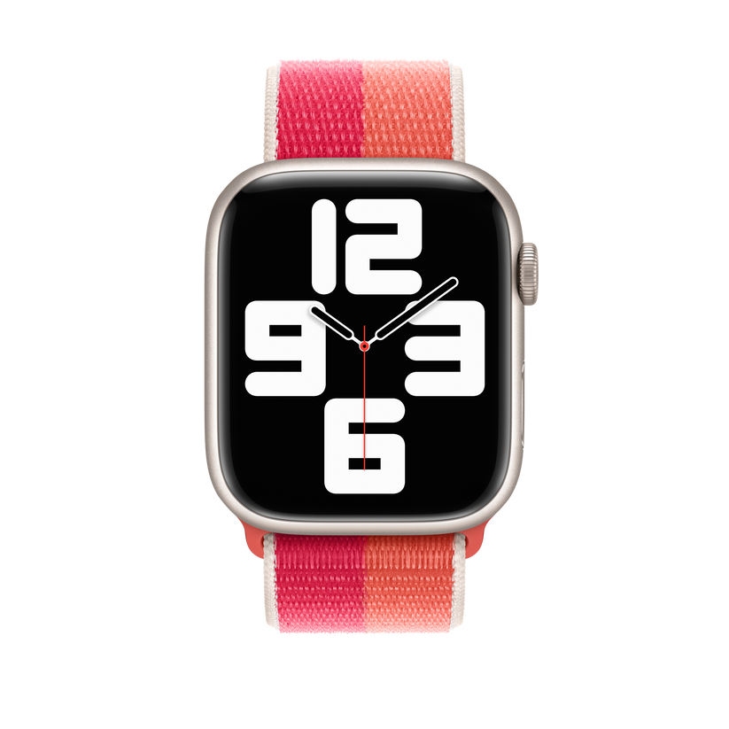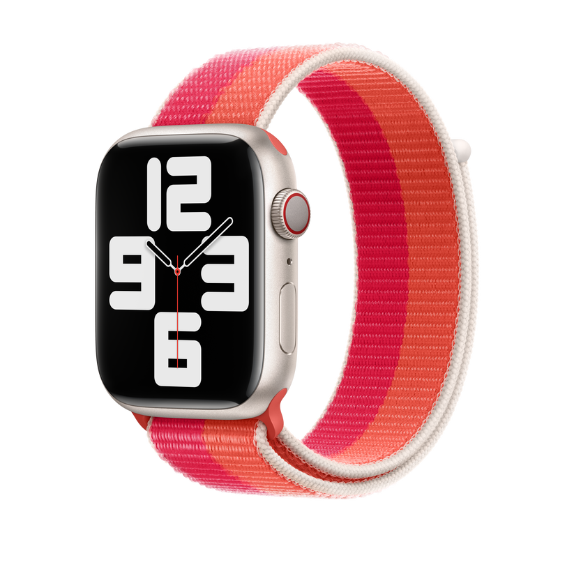 Soft, breathable and lightweight, the Sport Loop features a hook-and-loop fastener for quick and easy adjustment. The double-layer nylon weave has dense loops on the skin side that provide soft cushioning while allowing moisture to escape. This weave is made with 82% recycled yarn, some of which contains material from discarded fishing nets. This strap is carbon neutral. The Sport Loop contains 45% recycled content by weight, 100% of manufacturing electricity is covered by clean energy, and 50% or more of all carbon-neutral Apple Watch products are shipped without aeroplanes.