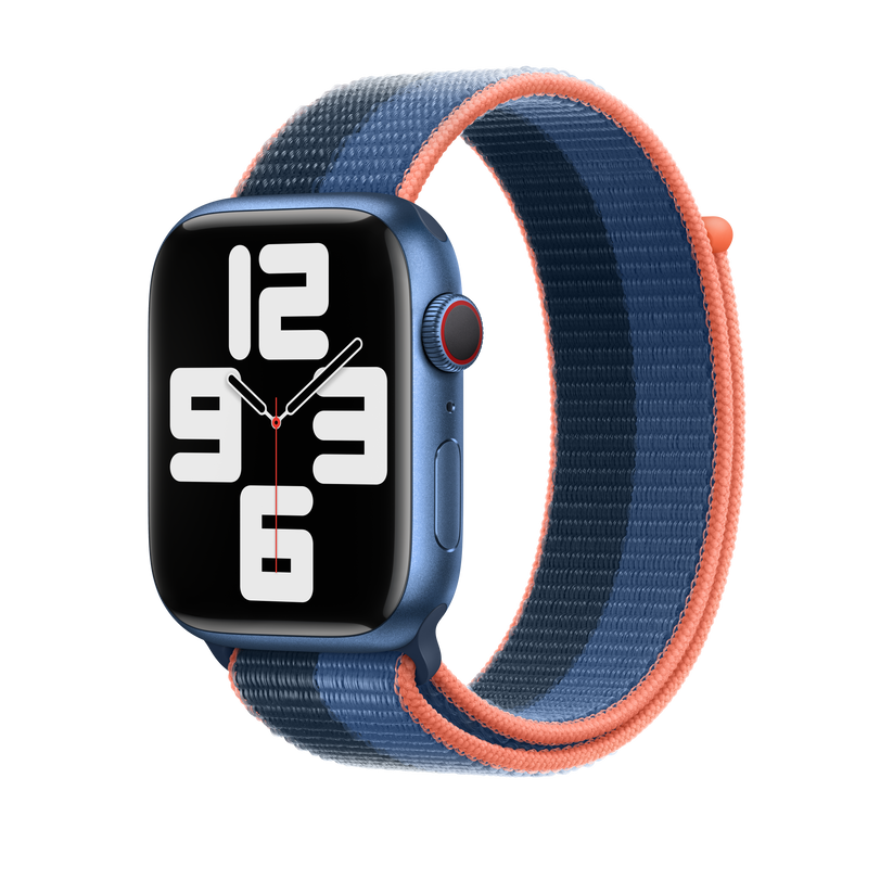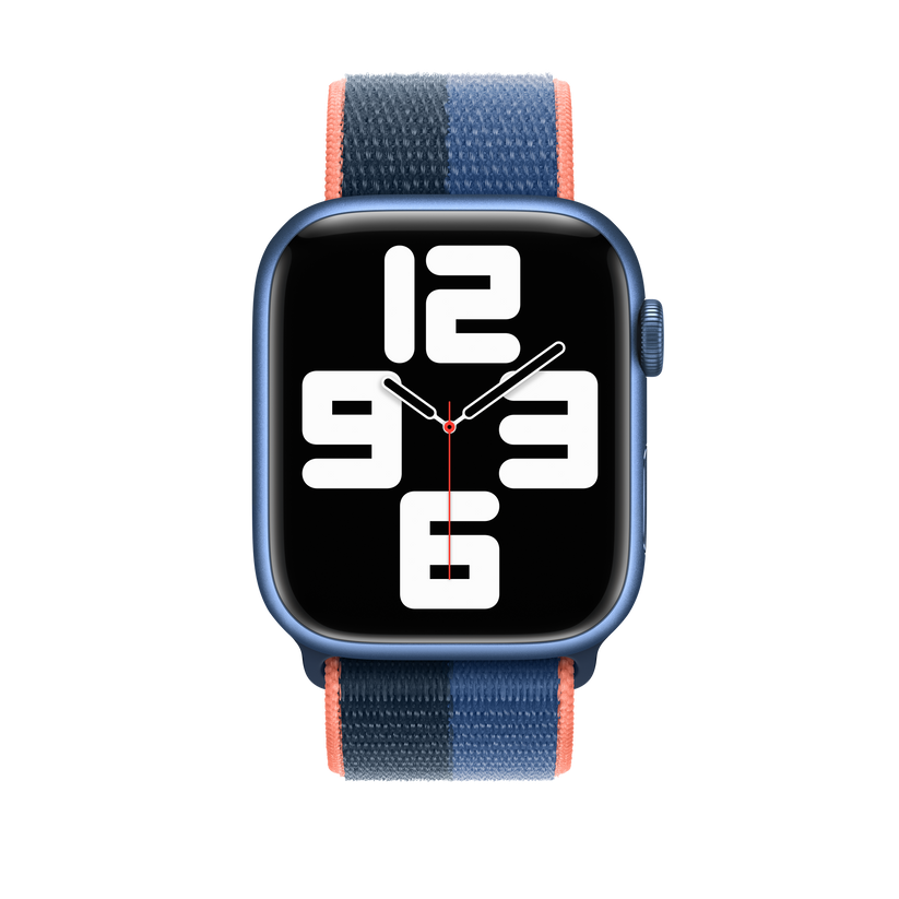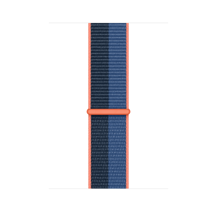 Soft, breathable and lightweight, the Sport Loop features a hook-and-loop fastener for quick and easy adjustment. The double-layer nylon weave has dense loops on the skin side that provide soft cushioning while allowing moisture to escape. This weave is made with 82% recycled yarn, some of which contains material from discarded fishing nets. This strap is carbon neutral. The Sport Loop contains 45% recycled content by weight, 100% of manufacturing electricity is covered by clean energy, and 50% or more of all carbon-neutral Apple Watch products are shipped without aeroplanes.