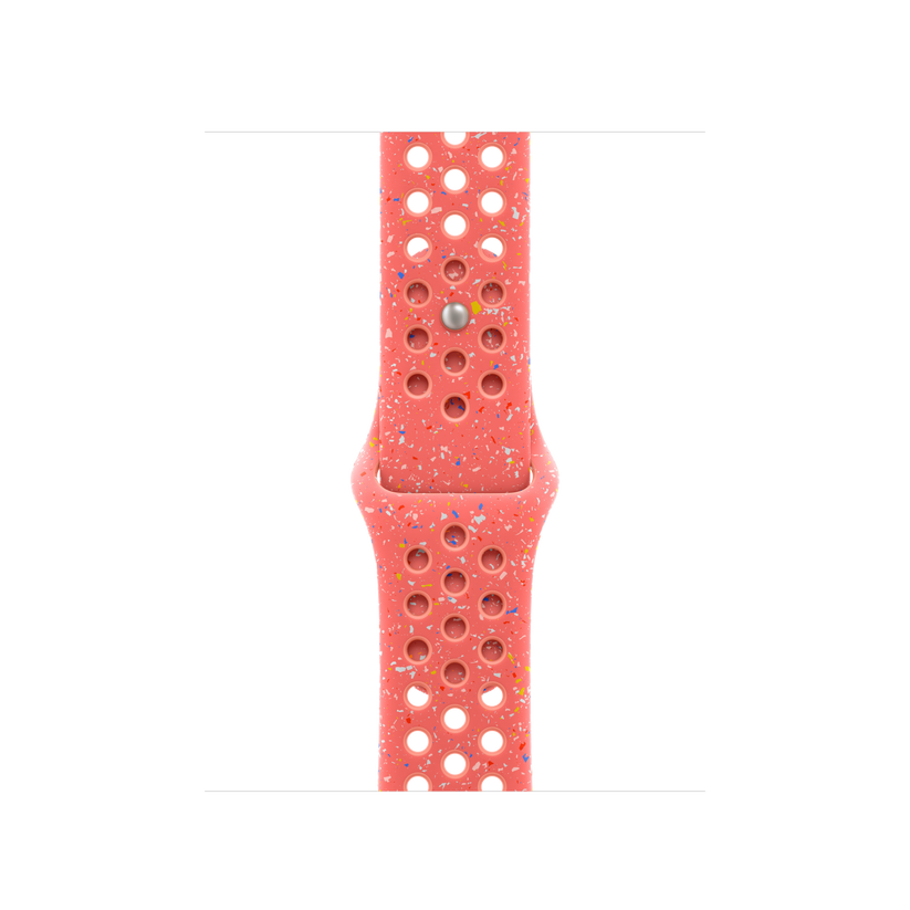 Made with compression-moulded perforations for breathability, the Nike Sport Band is durable and strong, yet surprisingly soft. It features colourful flakes that create a randomised pattern, making each strap completely unique. The smooth, dense material drapes elegantly across your wrist and feels comfortable next to your skin. A new aluminium pin-and-tuck closure gives the pin a fresh matt finish. This strap contains at least 32% recycled fluoroelastomer, with each flake containing at least 66% recycled fluoroelastomer.